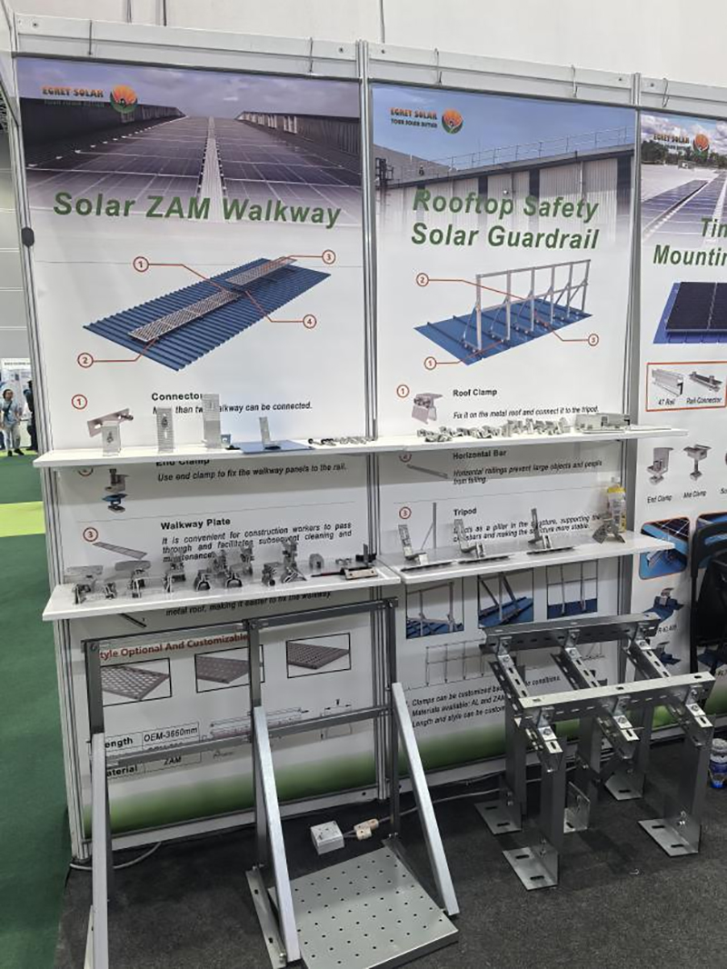 Pada pameran tersebut, kami memamerkan beberapa aksesoris rooftop, antara lain klem, pengait, dan kaki L. Pelanggan dapat memilih kombinasi berbeda berdasarkan lingkungan instalasinya. Klem atau kaki L digunakan untuk genteng baja lapis warna, sedangkan pengait genteng solar digunakan untuk genteng keramik. Kami juga dapat menyesuaikan klem berdasarkan model ubin baja berlapis warna pelanggan atau memperpanjang lengan pengait agar sesuai dengan penggunaan di lokasi.